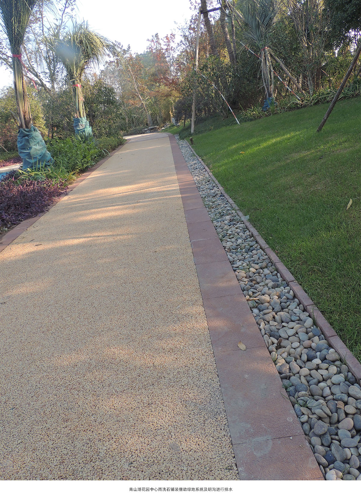 通過(guò)對(duì)鋪裝材料透氣性、生態(tài)性研究及鋪裝結(jié)構(gòu)層施工工藝改進(jìn)等措施,結(jié)合園林景觀地形處理、設(shè)置排水設(shè)施等手段,建立生態(tài)型鋪裝體系。